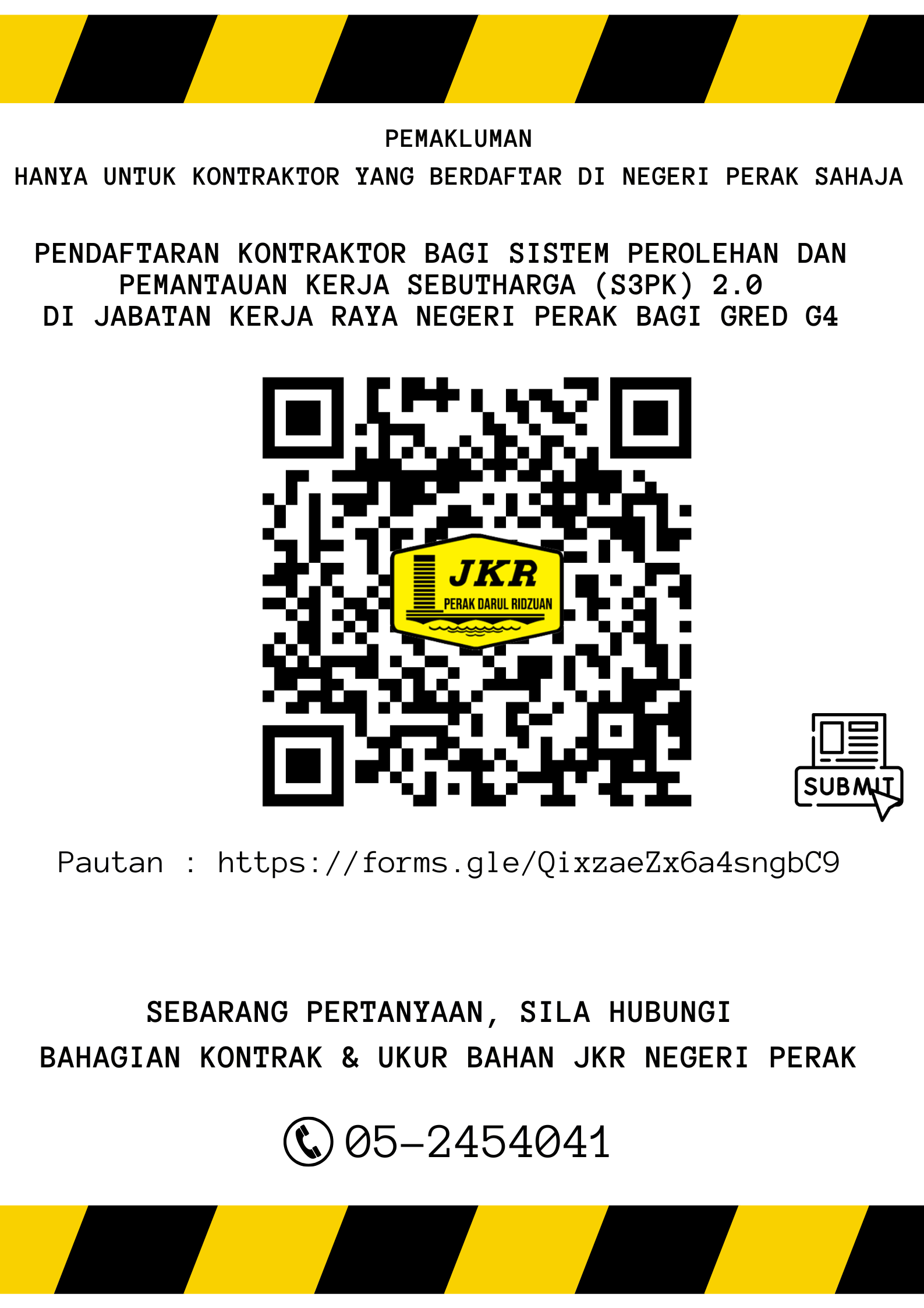 PENDAFTARAN KONTRAKTOR BAGI SISTEM PEROLEHAN DAN PEMANTAUAN KERJA SEBUTHARGA (S3PK) 2.0 DI JABATAN KERJA RAYA NEGERI PERAK BAGI GRED G4.