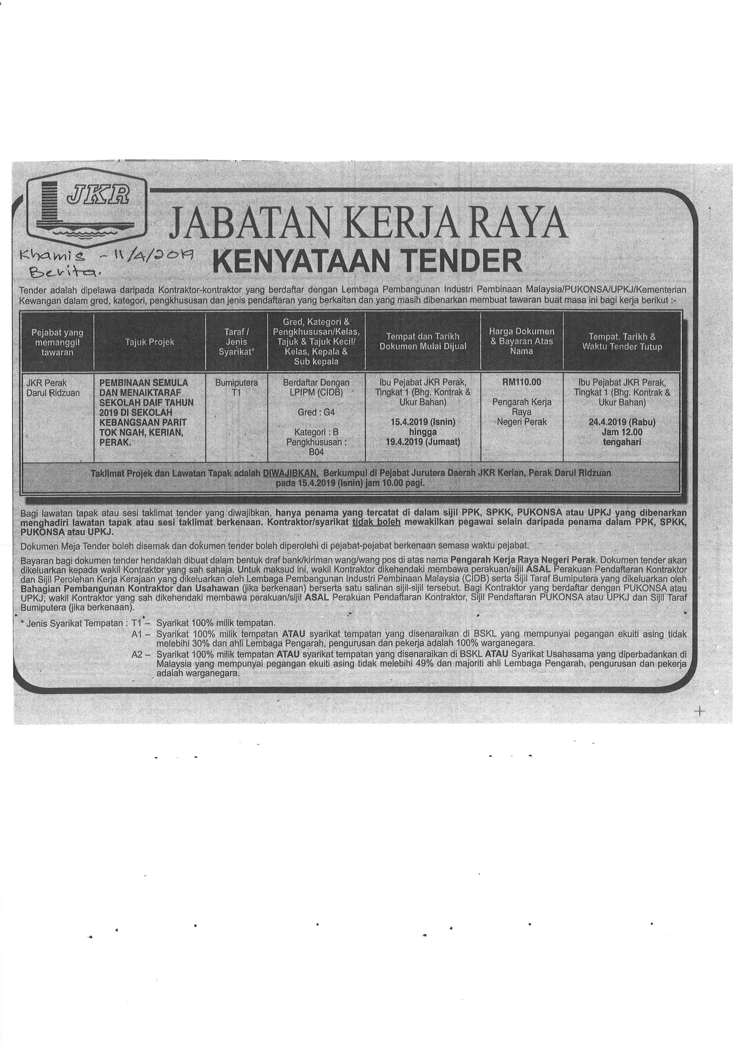 IKLAN TENDER - PEMBINAAN SEMULA DAN MENAIKTARAF SEKOLAH DAIF TAHUN 2019 DI SEKOLAH KEBANGSAAN PARIT TOK NGAH , KERIAN , PERAK DARUL RIDZUAN - G4