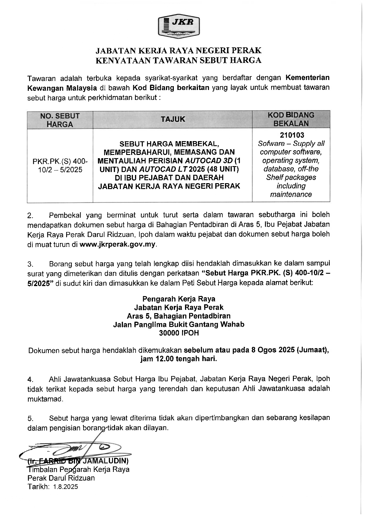 PELAWAAN SEBUTHARGA MEMBEKAL,MEMPERBAHARUI, MEMASANG DAN MENTAULIAH PERISIAN AUTOCAD 3D (1 UNIT) DAN AUTOCAD 2D LT 2025 (48 UNIT) DI IBU PEJABAT DAN DAERAH JKR NEGERI PERAK