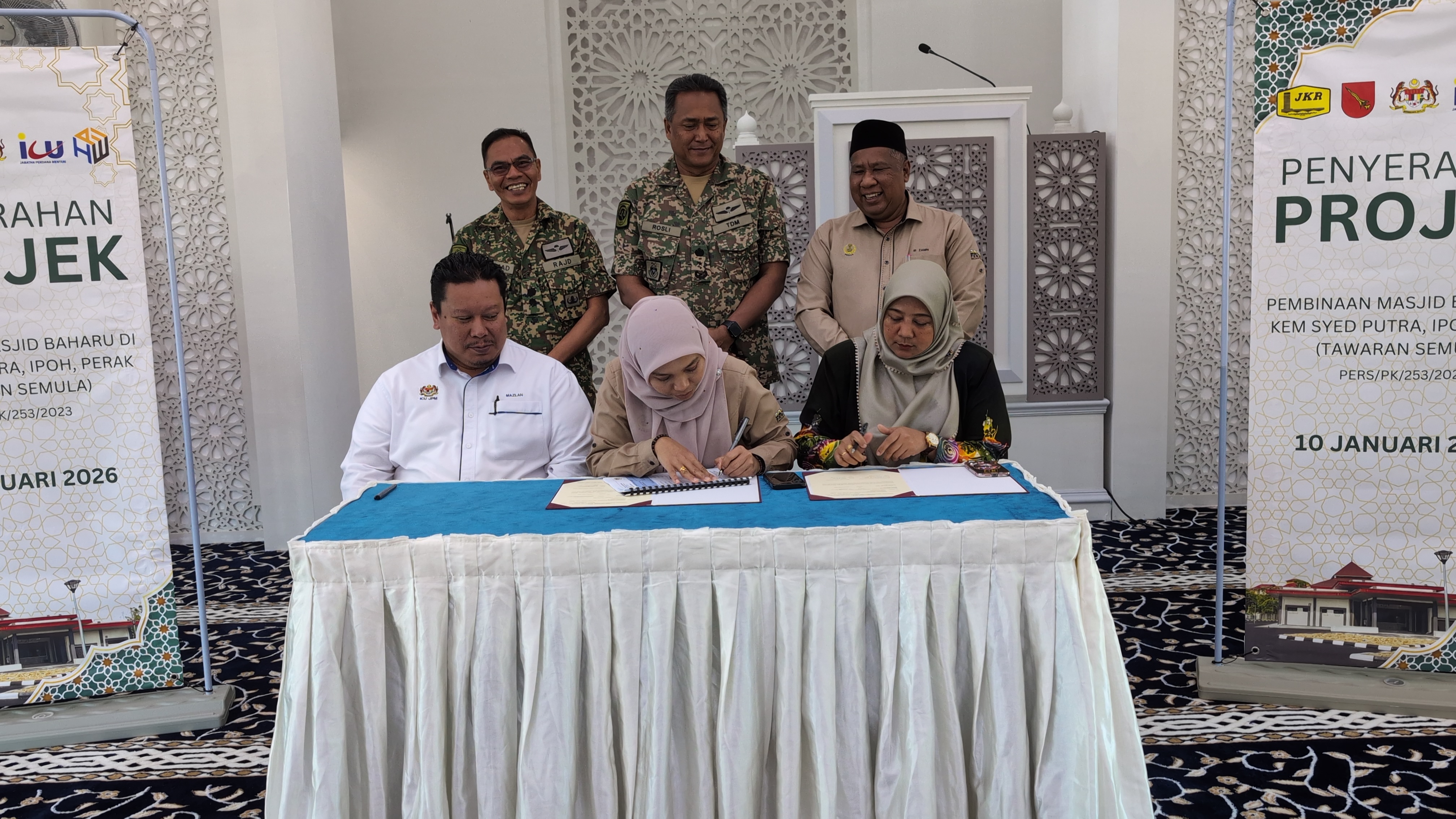 ๐ญ๐ฌ.๐ฌ๐ญ.๐ฎ๐ฌ๐ฎ๐ฒ : Program Penyerahan Projek Pembinaan Masjid Baharu di Kem Syed Putra, Ipoh Perak Darul Ridzuan. (Tawaran Semula). Penyerahan ini telah disempurnakan oleh YBrs. Ir. Haji Zamri bin Mat Kasim, Pengarah Jabatan Kerja Raya Negeri Perak kepada Tuan Mazlan Zurin Bin Zulkifli, Timbalan Pengarah Pejabat Pembangunan Negeri Perak dengan disaksikan oleh Brigedier Jeneral Datoโ Mohd Rosli Bin Abu Bakar, Panglima 2 Briged dan Puan Ir. Atikah Binti Md Radzi, Jurutera Daerah JKR Kinta.