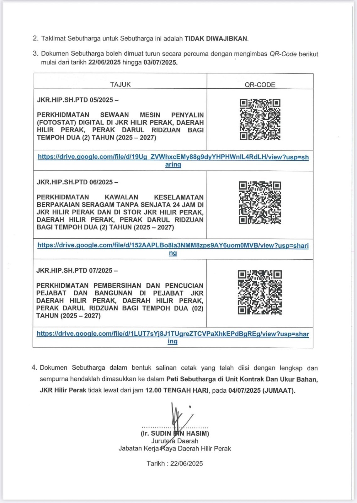 3. Dokumen Sebutharga ini boleh dimuat turun secara percuma dengan mengimbas QR-Code yang disertakan seperti di bawah mulai dari tarikh 22/06/2025 hingga 03/07/2025.