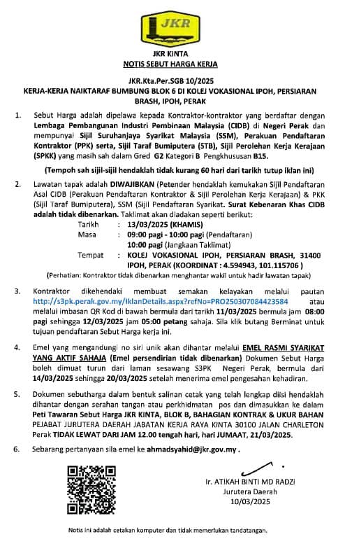 Lawatan tapak adalah DIWAJIBKAN (Penyebut harga hendaklah kemukakan Sijil Pendaftaran Asal CIDB (Perakuan Pendaftaran Kontraktor & Sijil Perolehan Kerja Kerajaan) & PKK (Sijil Taraf Bumiputera), SSM (Sijil Pendaftaran Syarikat.