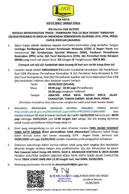 Lawatan tapak adalah DIWAJIBKAN (Penyebut harga hendaklah kemukakan Sijil Pendaftaran Asal CIDB (Perakuan Pendaftaran Kontraktor & Sijil Perolehan Kerja Kerajaan) & PKK (Sijil Taraf Bumiputera), SSM (Sijil Pendaftaran Syarikat.