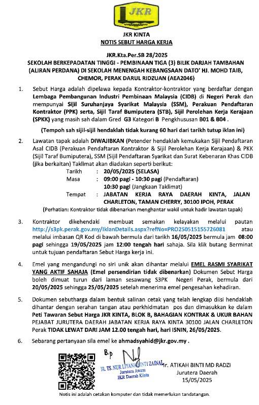 Lawatan tapak adalah DIWAJIBKAN (Penyebut harga hendaklah kemukakan Sijil Pendaftaran Asal CIDB (Perakuan Pendaftaran Kontraktor & Sijil Perolehan Kerja Kerajaan) & PKK (Sijil Taraf Bumiputera), SSM (Sijil Pendaftaran Syarikat.