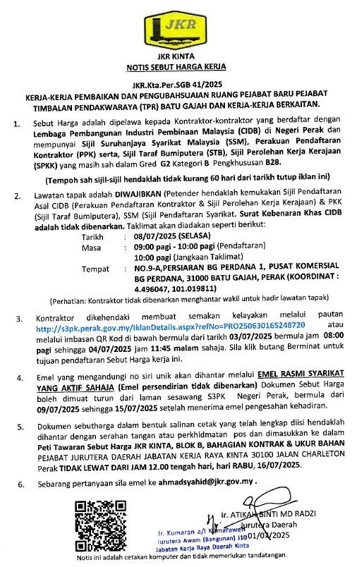 Lawatan tapak adalah DIWAJIBKAN (Penyebut harga hendaklah kemukakan Sijil Pendaftaran Asal CIDB (Perakuan Pendaftaran Kontraktor & Sijil Perolehan Kerja Kerajaan) & PKK (Sijil Taraf Bumiputera), SSM (Sijil Pendaftaran Syarikat.