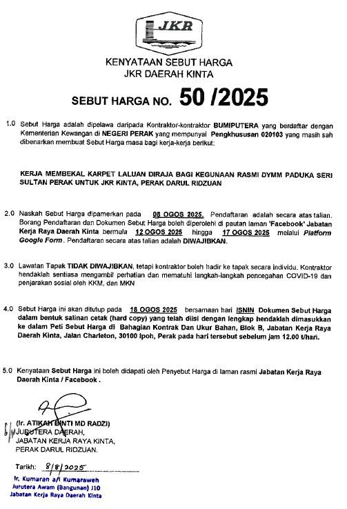 Borang Pendaftaran & Muat turun Dokumen Sebut Harga boleh diperolehi di pautan Laman Facebook JKR DAERAH KINTA melalui Platform 'GOOGLE FORM'.