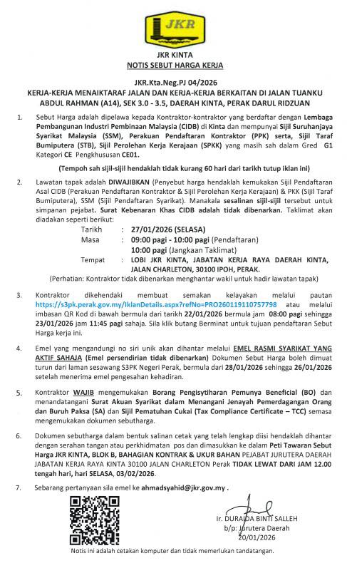 TEMPAT : LOBI JKR DAERAH KINTA, JABATAN KERJA RAYA DAERAH KINTA, JALAN CHARLETON, 30100 IPOH, PERAK.