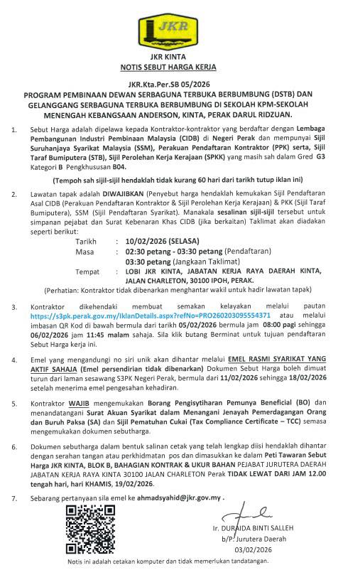 Lawatan tapak adalah DIWAJIBKAN (Penyebut harga hendaklah kemukakan Sijil Pendaftaran Asal CIDB (Perakuan Pendaftaran Kontraktor & Sijil Perolehan Kerja Kerajaan) & PKK (Sijil Taraf Bumiputera), SSM (Sijil Pendaftaran Syarikat.