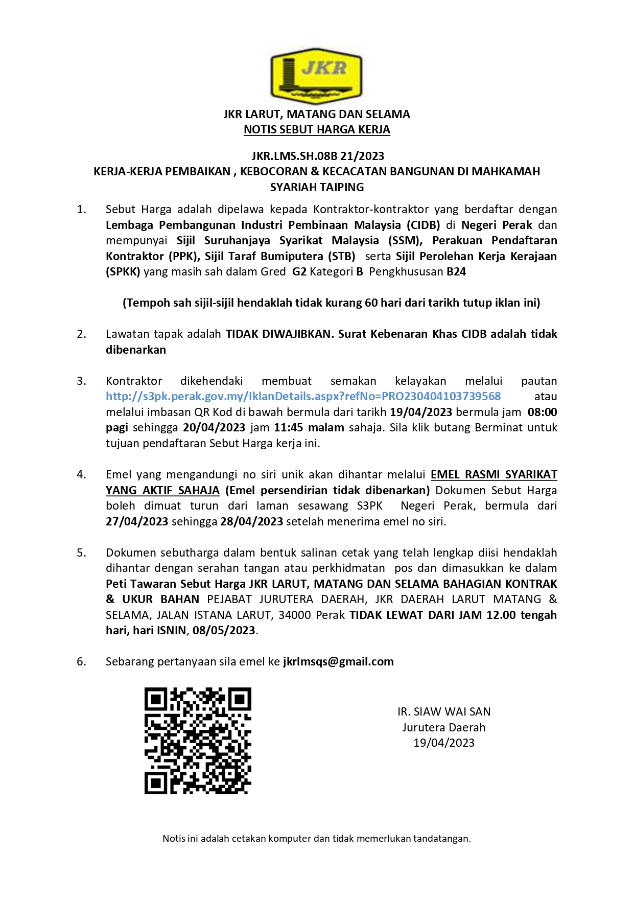 JKR.LMS.SH.08B 21/2023 - KERJA-KERJA PEMBAIKAN , KEBOCORAN & KECACATAN BANGUNAN DI MAHKAMAH SYARIAH TAIPING