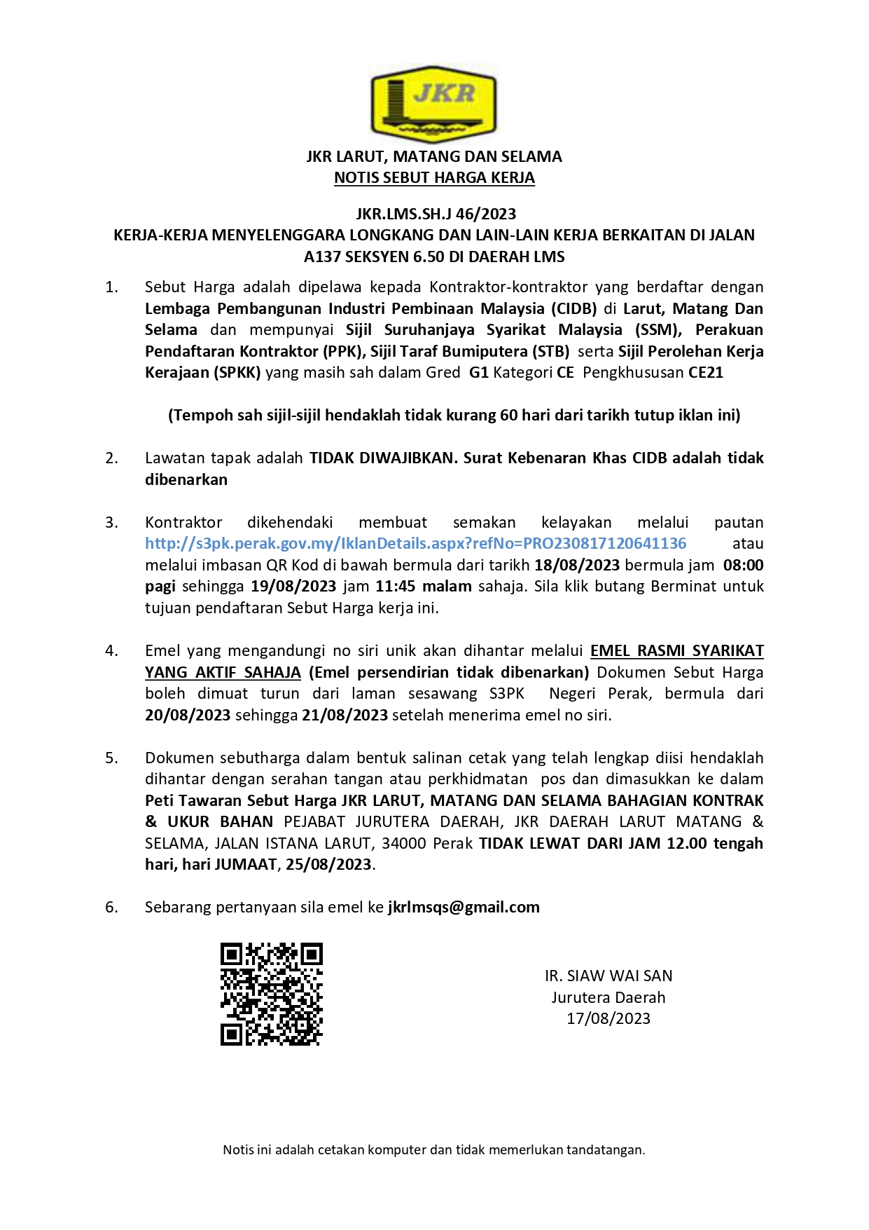 JKR.LMS.SH.J 46/2023 - KERJA-KERJA MENYELENGGARA LONGKANG DAN LAIN-LAIN KERJA BERKAITAN DI JALAN A137 SEKSYEN 6.50 DI DAERAH LMS