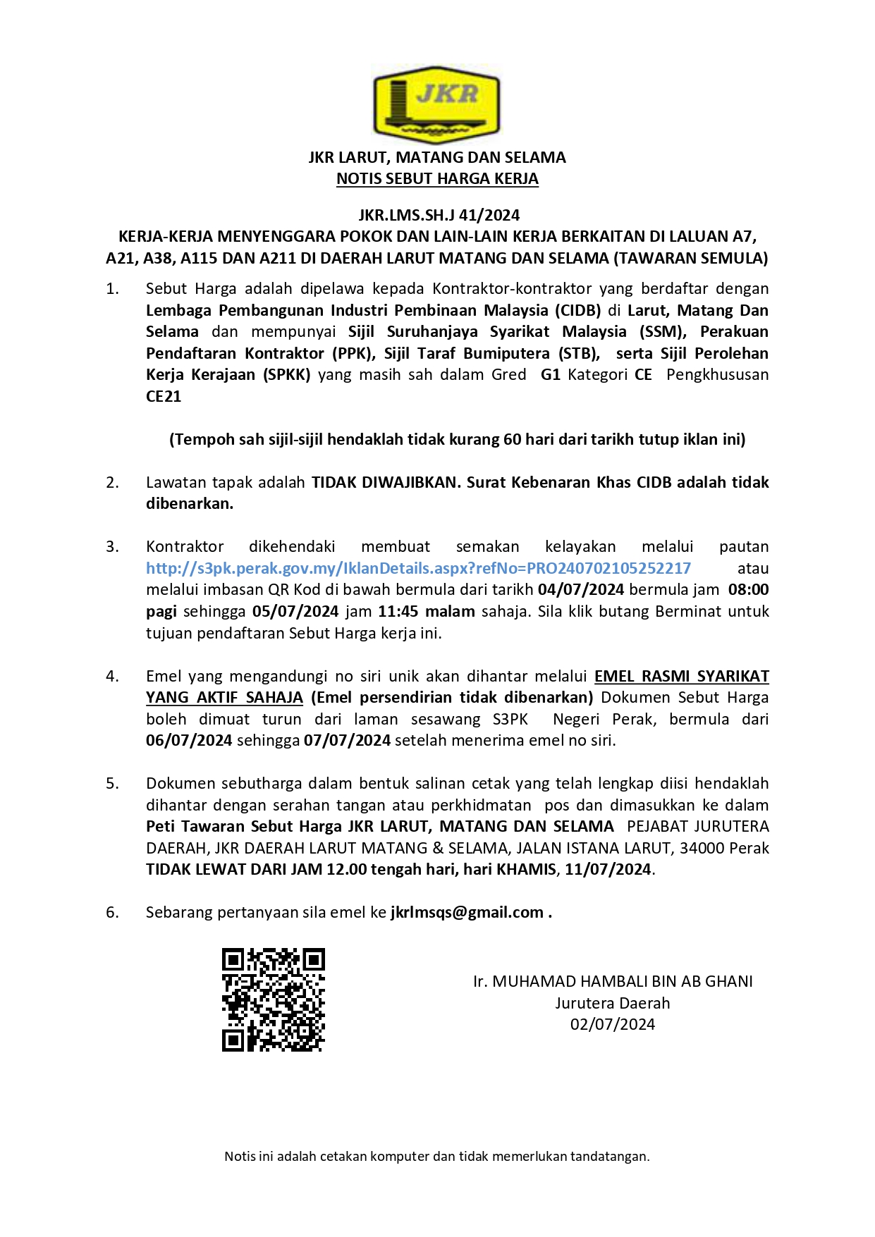 JKR.LMS.SH.J 41/2024 - KERJA-KERJA MENYENGGARA POKOK DAN LAIN-LAIN KERJA BERKAITAN DI LALUAN A7, A21, A38, A115 DAN A211 DI DAERAH LARUT MATANG DAN SELAMA (TAWARAN SEMULA)