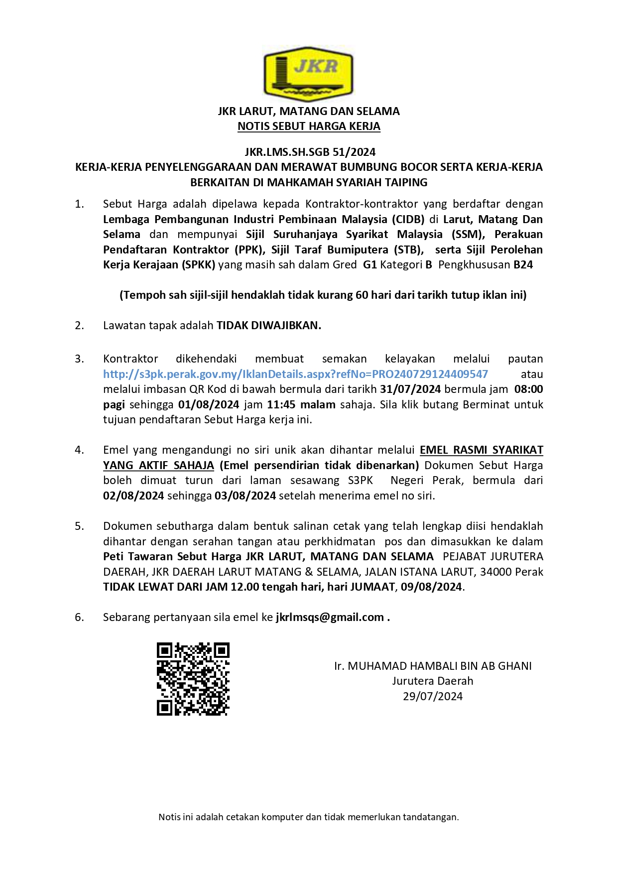 JKR.LMS.SH.SGB 51/2024 - KERJA-KERJA PENYELENGGARAAN DAN MERAWAT BUMBUNG BOCOR SERTA KERJA-KERJA BERKAITAN DI MAHKAMAH SYARIAH TAIPING