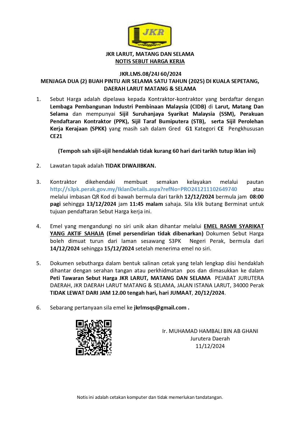 JKR.LMS.08/24J 60/2024 - MENJAGA DUA (2) BUAH PINTU AIR SELAMA SATU TAHUN (2025) DI KUALA SEPETANG, DAERAH LARUT MATANG & SELAMA