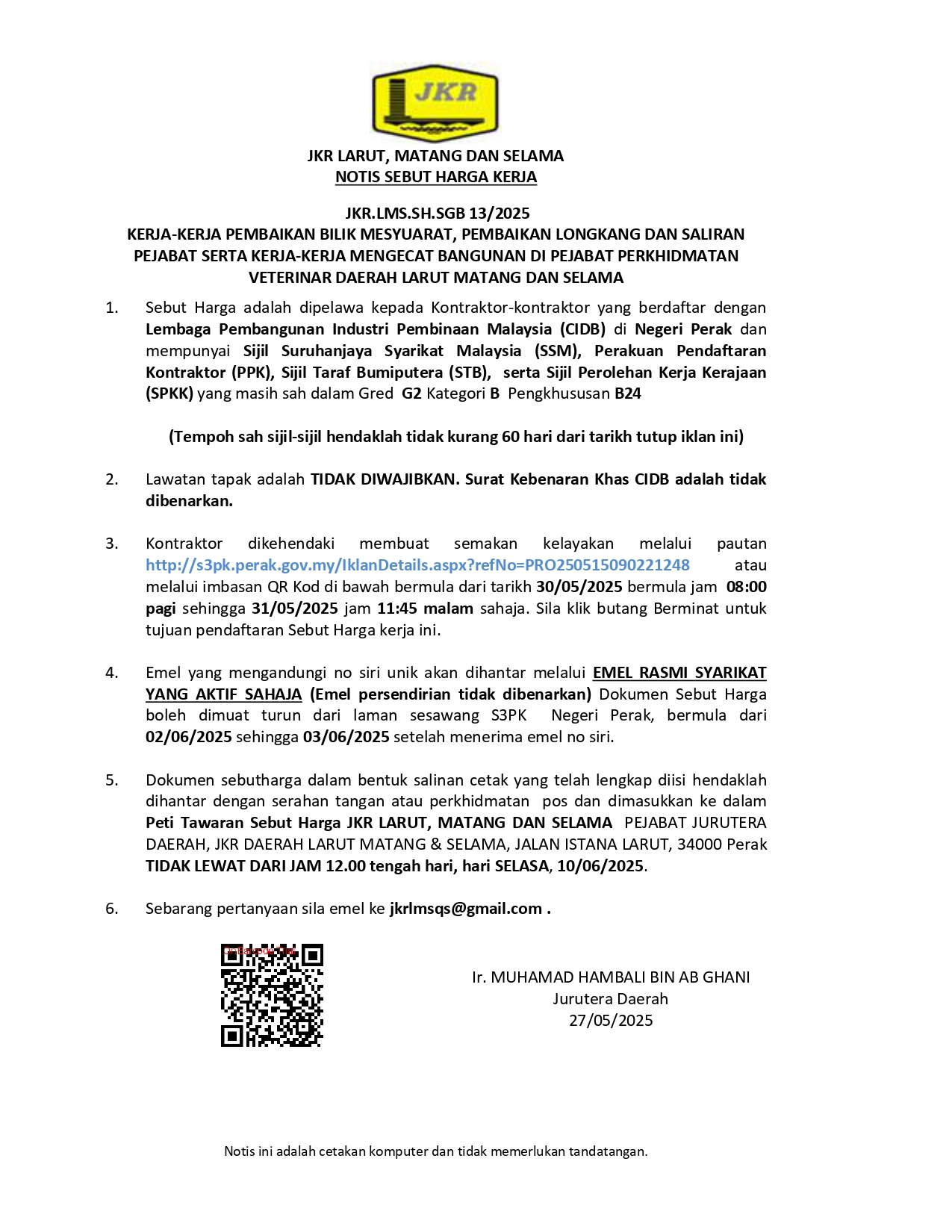 JKR.LMS.SH.SGB 13/2025 - KERJA-KERJA PEMBAIKAN BILIK MESYUARAT, PEMBAIKAN LONGKANG DAN SALIRAN PEJABAT SERTA KERJA-KERJA MENGECAT BANGUNAN DI PEJABAT PERKHIDMATAN VETERINAR DAERAH LARUT MATANG DAN SELAMA