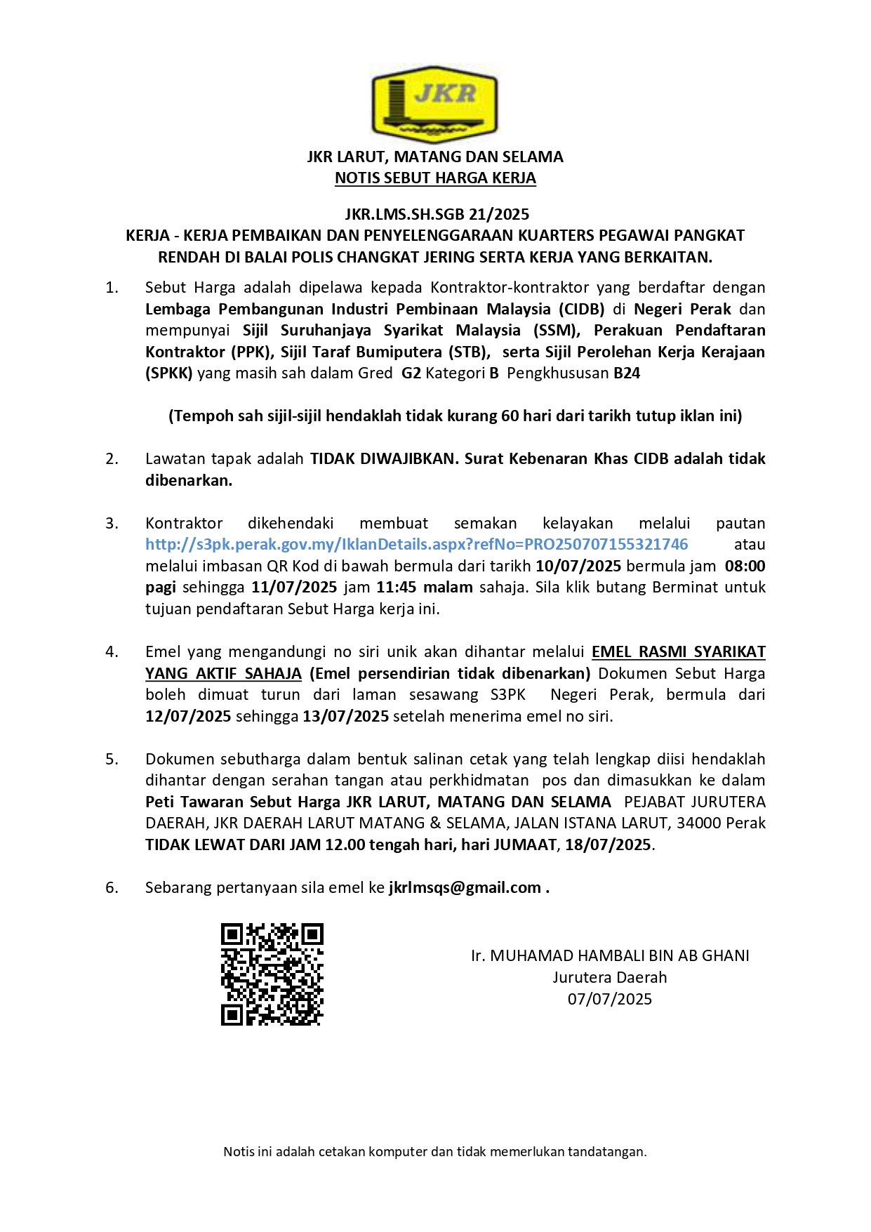 JKR.LMS.SH.SGB 21/2025 - KERJA - KERJA PEMBAIKAN DAN PENYELENGGARAAN KUARTERS PEGAWAI PANGKAT RENDAH DI BALAI POLIS CHANGKAT JERING SERTA KERJA YANG BERKAITAN.