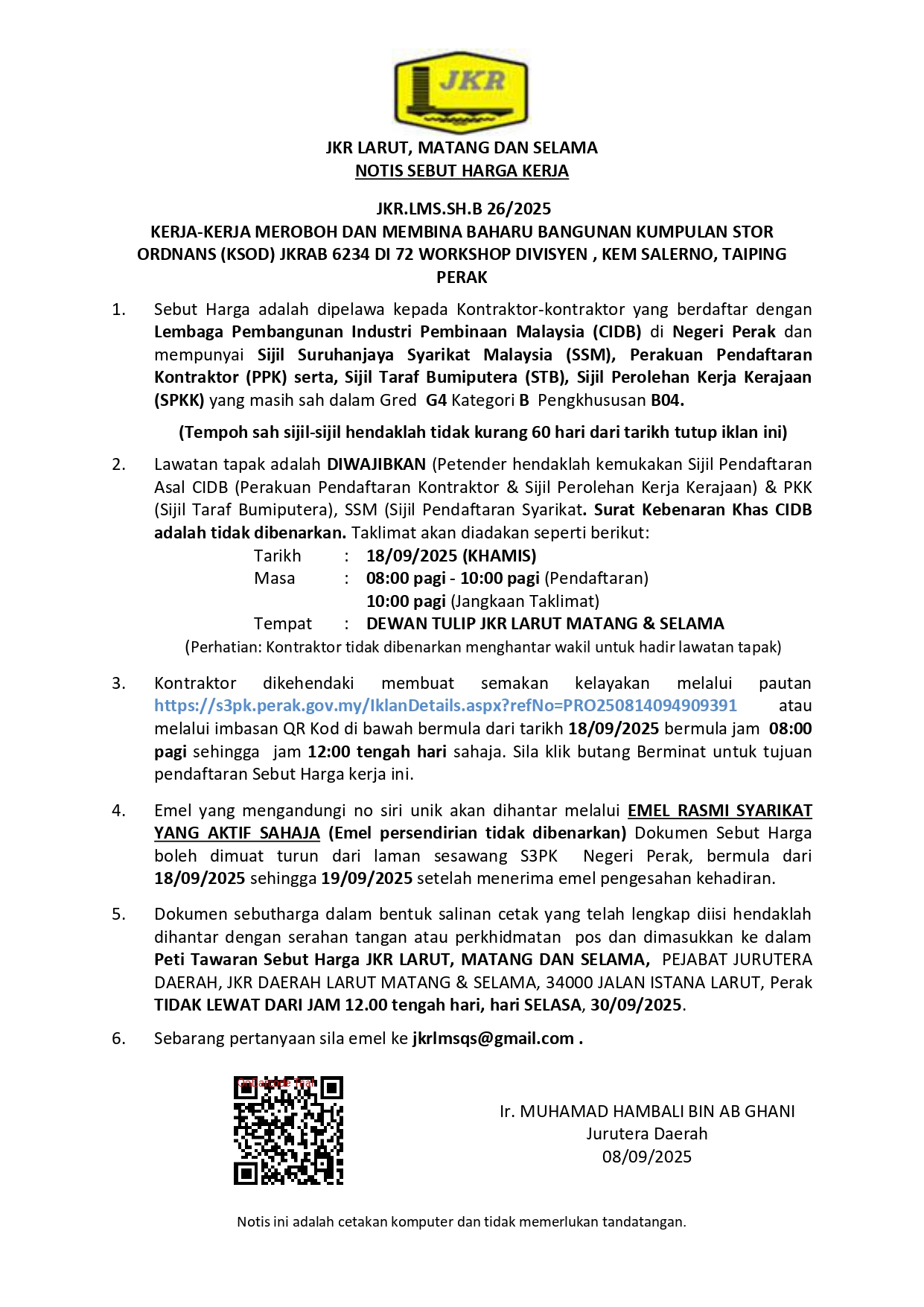 JKR.LMS.SH.B 26/2025 KERJA-KERJA MEROBOH DAN MEMBINA BAHARU BANGUNAN KUMPULAN STOR ORDNANS (KSOD) JKRAB 6234 DI 72 WORKSHOP DIVISYEN , KEM SALERNO, TAIPING PERAK