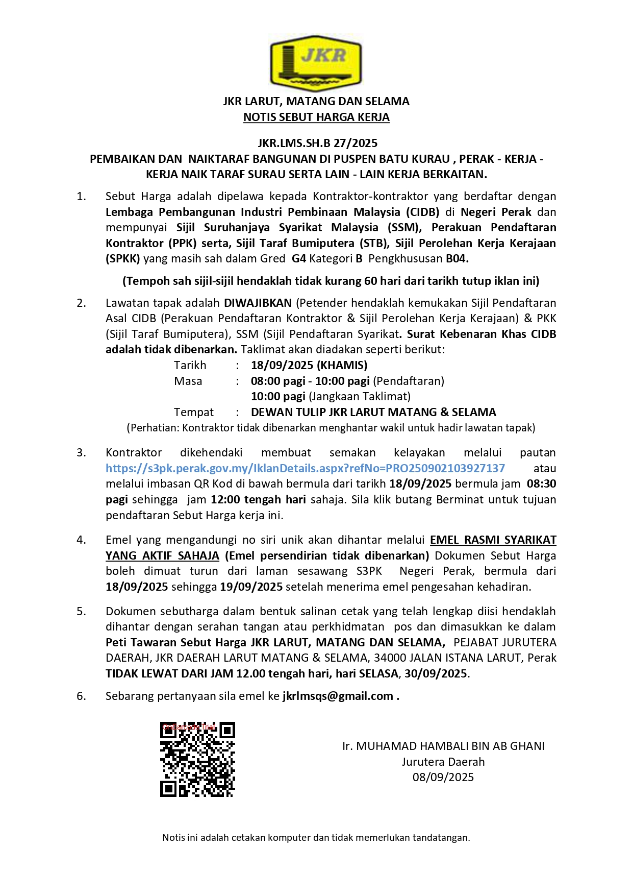 JKR.LMS.SH.B 27/2025 PEMBAIKAN DAN NAIKTARAF BANGUNAN DI PUSPEN BATU KURAU , PERAK - KERJA - KERJA NAIK TARAF SURAU SERTA LAIN - LAIN KERJA BERKAITAN.
