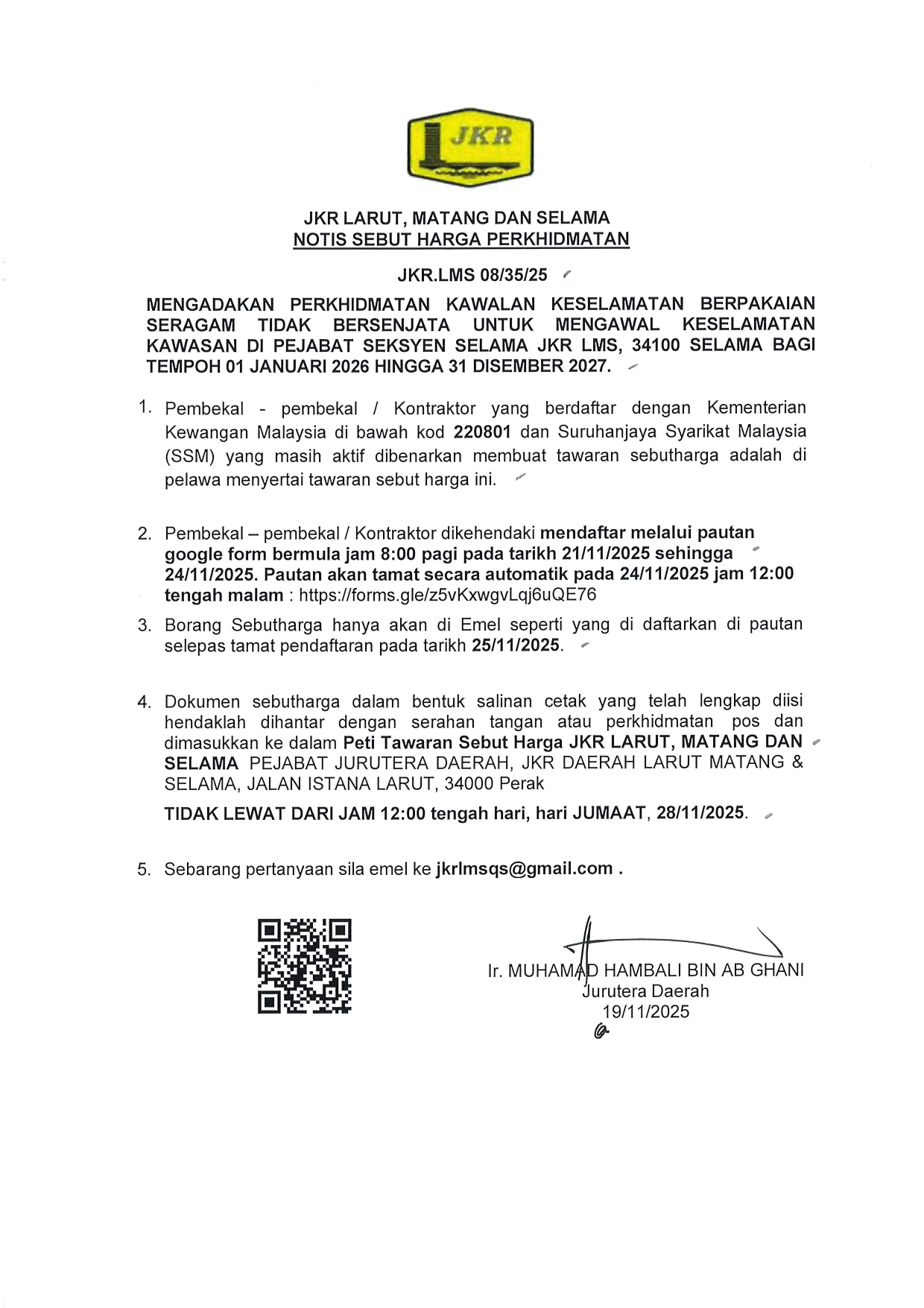 JKR.LMS 08/35/25 MENGADAKAN PERKHIDMATAN KAWALAN KESELAMATAN BERPAKAIAN SERAGAM TIDAK BERSENJATA UNTUK MENGAWAL KESELAMATAN KAWASAN DI PEJABAT SEKSYEN SELAMA JKR LMS, 34100 SELAMA BAGI TEMPOH 01 JANUARI 2026 HINGGA 31 DISEMBER 2027.