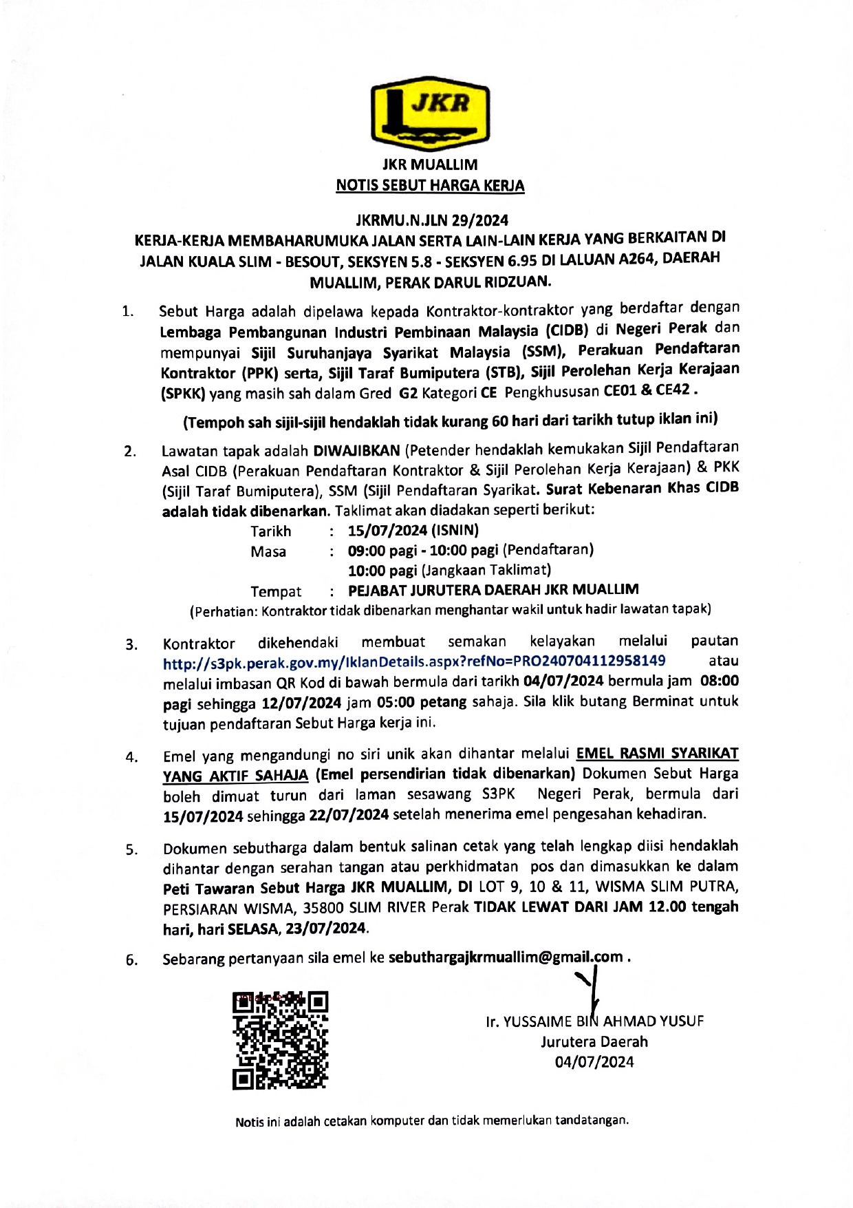 KERJA-KERJA MEMBAHARUMUKA JALAN SERTA LAIN-LAIN KERJA YANG BERKAITAN DI JALAN KUALA SLIM - BESOUT, SEKSYEN 5.8 - SEKSYEN 6.95 DI LALUAN A264, DAERAH MUALLIM, PERAK DARUL RIDZUAN