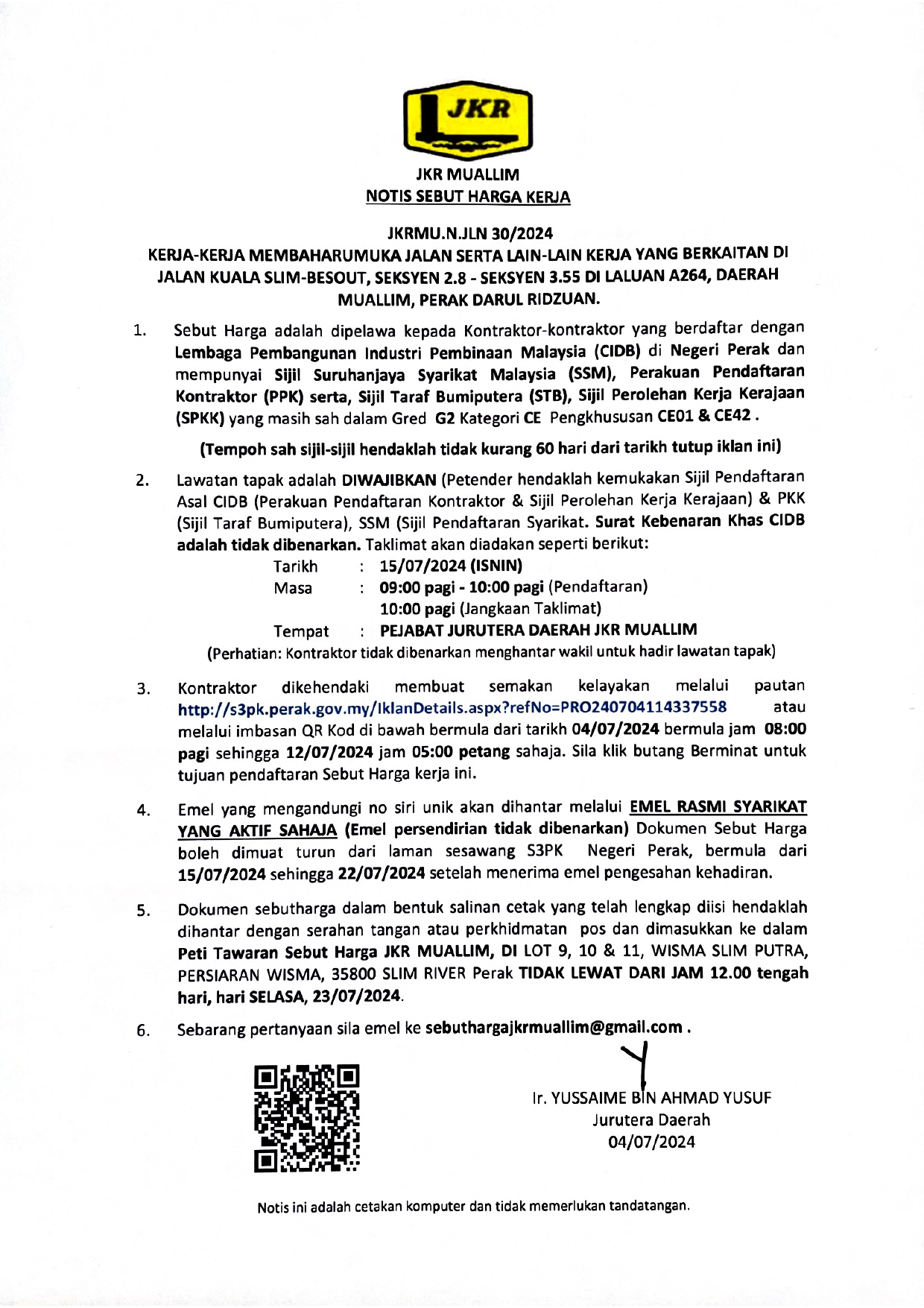 KERJA-KERJA MEMBAHARUMUKA JALAN SERTA LAIN-LAIN KERJA YANG BERKAITAN DI JALAN KUALA SLIM-BESOUT, SEKSYEN 2.8 - SEKSYEN 3.55 DI LALUAN A264, DAERAH MUALLIM, PERAK DARUL RIDZUAN