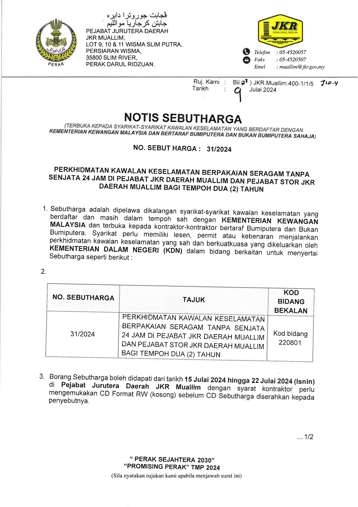 PERKHIDMATAN KAWALAN KESELAMATAN BERPAKAIAN SERAGAM TANPA SENJATA 24 JAM DI PEJABAT JKR DAERAH MUALLIM DAN PEJABAT STOR JKR DAERAH MUALLIM BAGI TEMPOH DUA (2) TAHUN